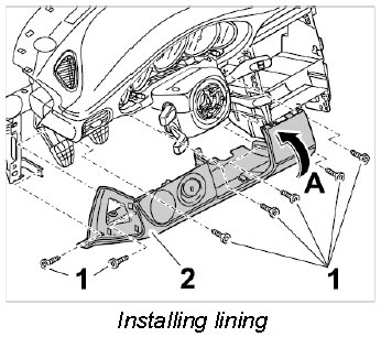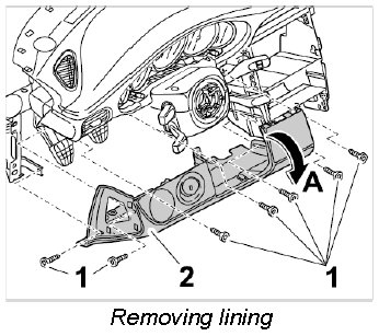 1. Unscrew the fastening screws -1- and swivel the cover under the instrument panel on the driver's side -2- downwards -arrow A-.