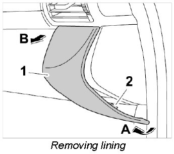 2. Take off the cover under the instrument panel on the passenger's side -1- to the rear -arrow B-.