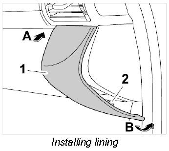 1. Insert the cover under the instrument panel on the passenger's side -1- from above -arrow A-.