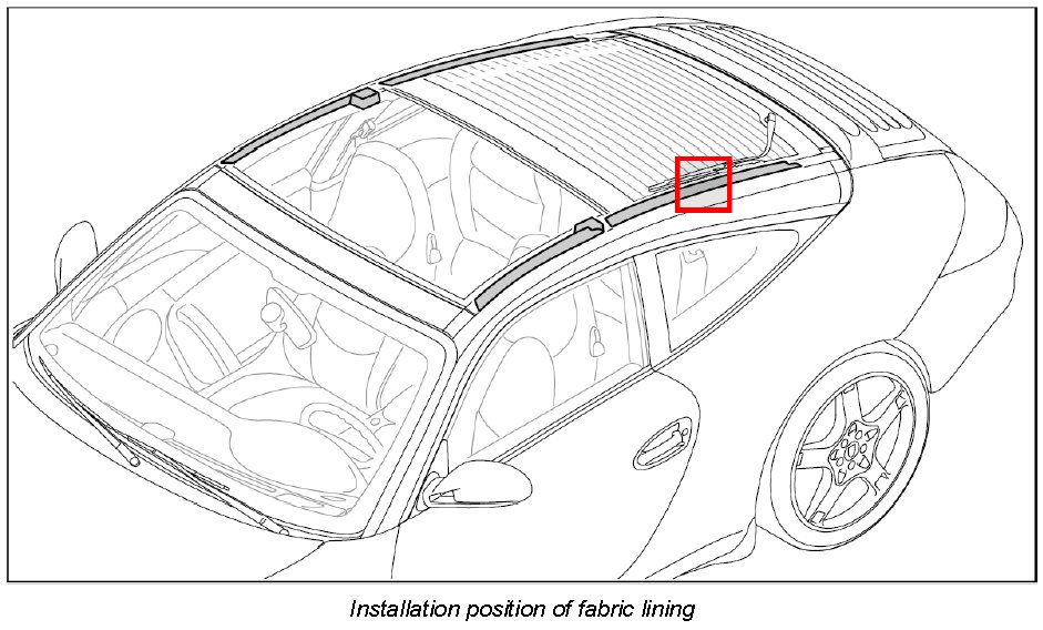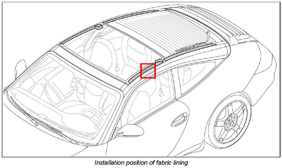 - The wire harness for the sun blind is integrated in the left fabric lining. The procedure for removing and installing the left fabric lining is described in the section relating to the wire harness for the sun blind. Refer to Removing and installing wire harness for roof assembly.