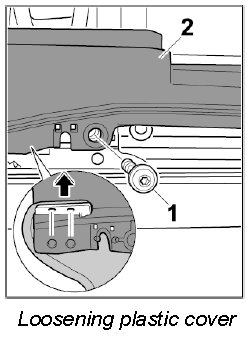 2. Unscrew fastening screw -1- on the plastic cover -2-. Lift the plastic cover up slightly and loosen the bead -arrow-.