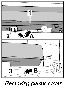 3. Disengage plastic cover -1- from the metal clip -2- (-arrow A-) and detach at the roof frame -3- by pulling it forward -arrow B-.