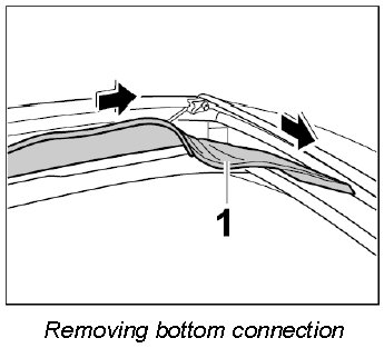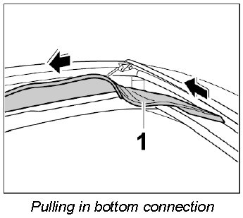 2. Pull fabric lining -1- with bottom connection seal backwards out of the guide in -direction of arrow-.