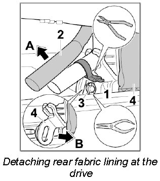 1.2. Pull off retainer -3- using a pointed-nose pliers and detach fabric lining -4- at the bolt on the drive -arrow B-.