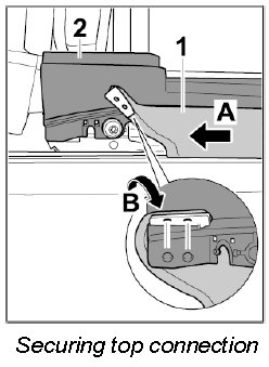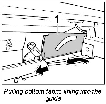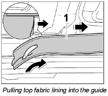 1. Pull fabric lining -1- with top connection seal backwards into the guide in -direction of arrow-.