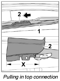 2. Pull the connection seal of the fabric lining -1- into the plastic cover -2- (-arrow-) until the plastic cover -2- is exposed by only -dimension X= 60 mm-.