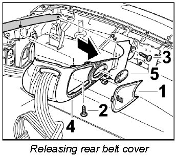 3. Pull rear belt cover -4- forward in direction of travel, pull connector off the interior light -5- and set rear belt cover -4- aside.