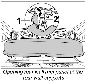 1. Open rear wall trim panel -1- at the rear wall supports -2- at the left and right.