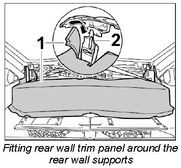 2. Fit rear wall trim panel -1- around the rear wall supports -2- at the left and right and close it.