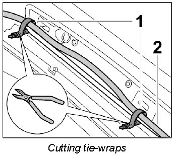 2. Cut tie-wraps -1- on the wire harness -2-.