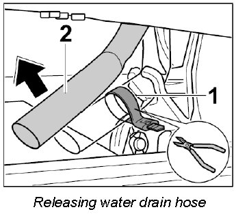 3. Cut tie-wraps -1- on the water drain hose -2- at the right and left. Pull the water drain hose out of the holder.