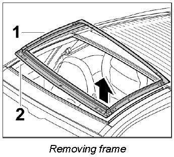 4. Raise the frame for the sliding roof cover -1- at the front and guide it upwards out of the roof assembly frame -2- - first pull the right side of the frame and then the left side up and out.
