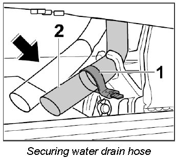 6. Engage water drain hose -2- at the right and left in the bracket and secure with tie-wraps -1-.