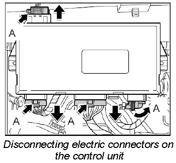 2. Release electric connectors -A- on the control unit and disconnect them.
