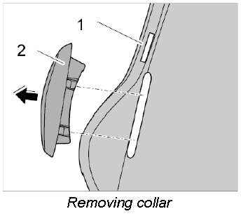 2. Insert a plastic wedge between the cushion carrier -1- and the collar -2- and unclip collar.