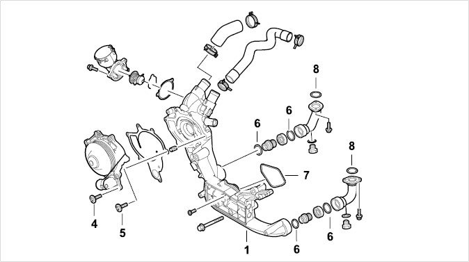 Loosen spring band clamps -2, 5- and pull off coolant hoses -3, 4-.