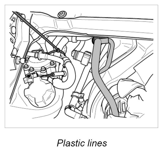 4. Release lines over the fuel distributor pipe (unclip lines from the holders and secure with a tie-wrap to the coolant expansion tank).
