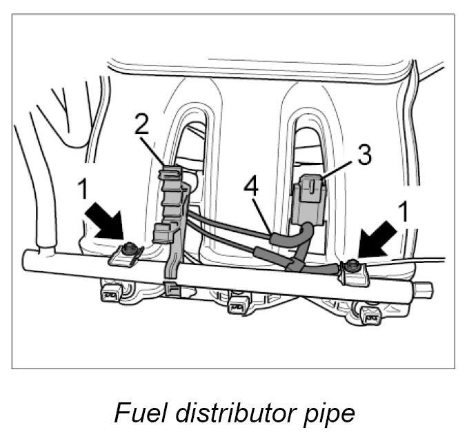 8. Remove fastening screws for fuel distributor pipe -1- and pull fuel distributor pipe together with fitted injection valves from the intake distributor. Check sealing rings of injection valves and replace if necessary.