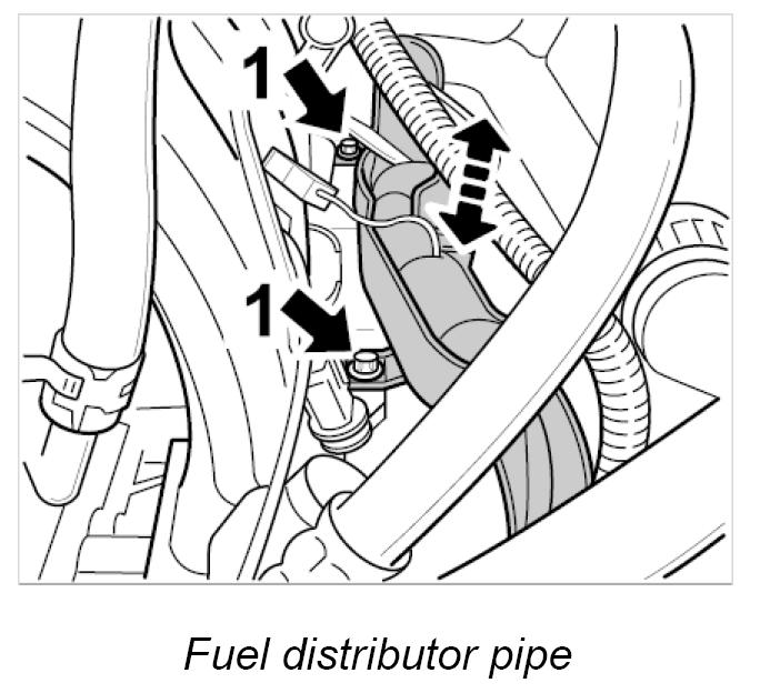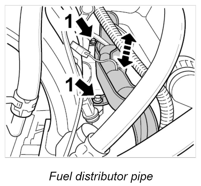 10. Remove fastening screws for fuel distributor pipe -1- and pull fuel distributor pipe together with fitted injection valves from the intake distributor. Check sealing rings of injection valves and replace if necessary.