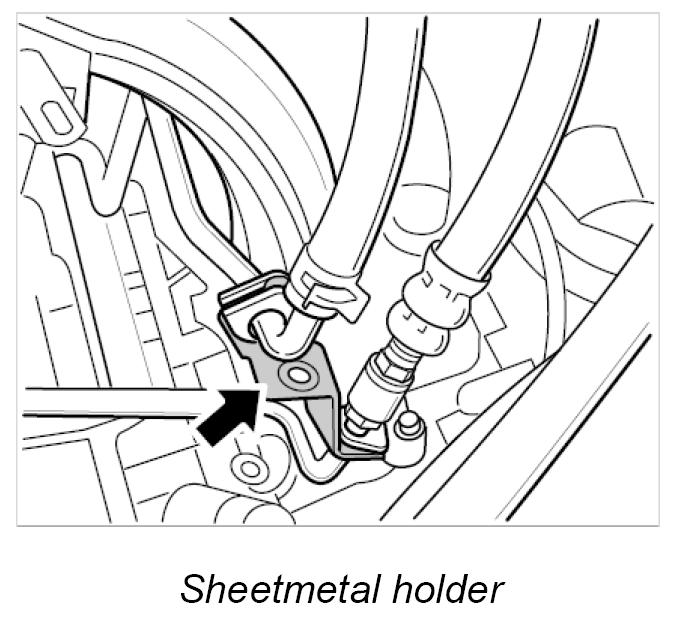 7. Pull the sheetmetal holder between the servo oil lines out of the rubber mounts and remove -arrow-.