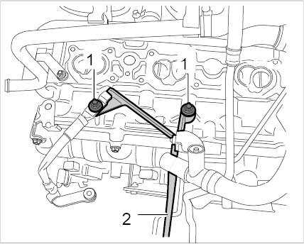 45. Secure line to the oil suction pumps at the cylinder head. Tighten union nut (a/f 27) and counter at the screw socket with an open ended wrench (a/f 24). -> Tightening torque: 40 Nm (30 ftlb.)