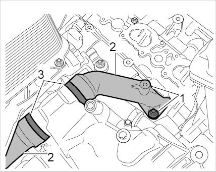 37. Remove coolant pipes -2-. Replace sealing sleeves -3- when joining the pipes again.