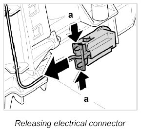 2. From the driver's side, reach around to the "driver's footwell" air vent to release and disconnect the electrical connector -a-.