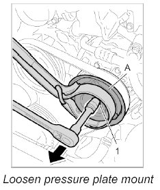 1. Use a commercially available strap wrench to securely hold the pressure plate -A- on the air-conditioning compressor, and undo the fastening screw -1-.