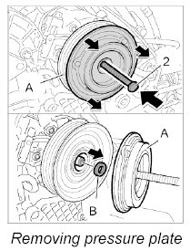 2. Screw in an M8 screw -2- into the thread of the pressure plate until the pressure plate -A- can be removed by hand.