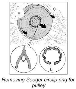 4. Use a Seeger circlip ring pliers to remove the Seeger circlip ring -E- on the pulley -C-.
