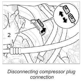7. Take out the electric connector -2- for the compressor from between the intake pipes and pull apart.