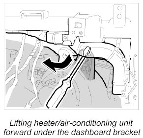 2. Lift heater/air-conditioning unit over the centre console and position under dashboard bracket.