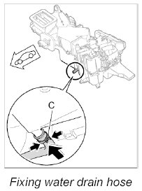 7. Check water drain hose for damage; if drain hose shows no sign of damage, connect hose to the drain on heater/air-conditioning unit and fix with the clamp -C-.
