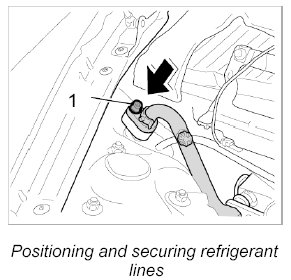18. Replace sealing rings for refrigerant lines and wet with refrigerant. Position refrigerant line and tighten with fastening screw -1-. - M8: 14 Nm (10.5 ftlb.)