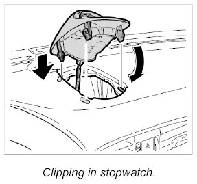 4. Run electrical lead into the dashboard, position the stopwatch with its cover over the dashboard and clip in the four clips.