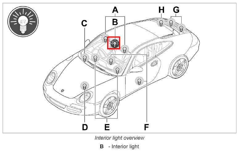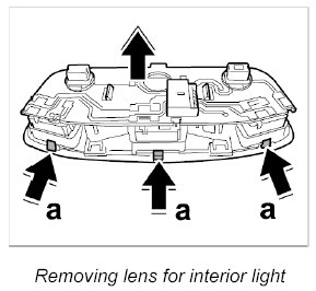 1. Carefully release lens at the three locking lugs on the interior light -arrow a- and remove interior light.