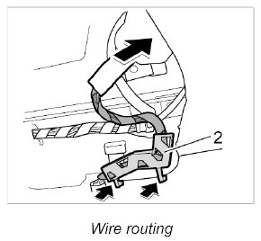 8. Engage holder -2- for the electric wire and push wire in behind the roof liner.