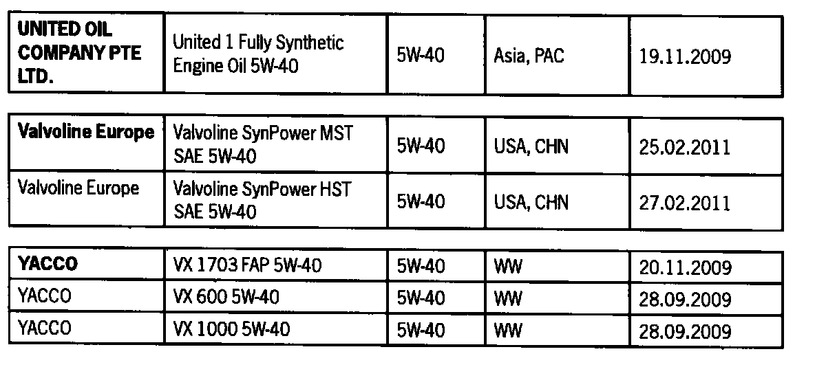 --> Manufacturer's Certificate 'Allocation of approved engine oils (36/08)'