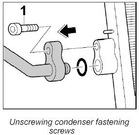 INFORMATION: When loosening or tightening the M8 refrigerant lines on the condenser, always counter with a 21-mm open-ended wrench.