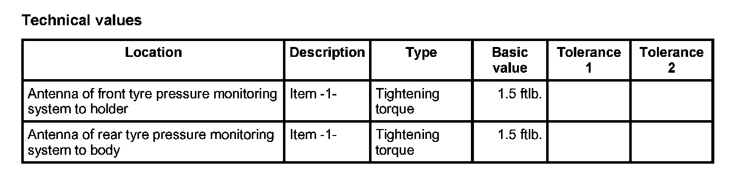 3. Position antenna of tire pressure monitoring system and secure with both fastening nuts -1-. - Tightening torque: 1.5 ftlb.