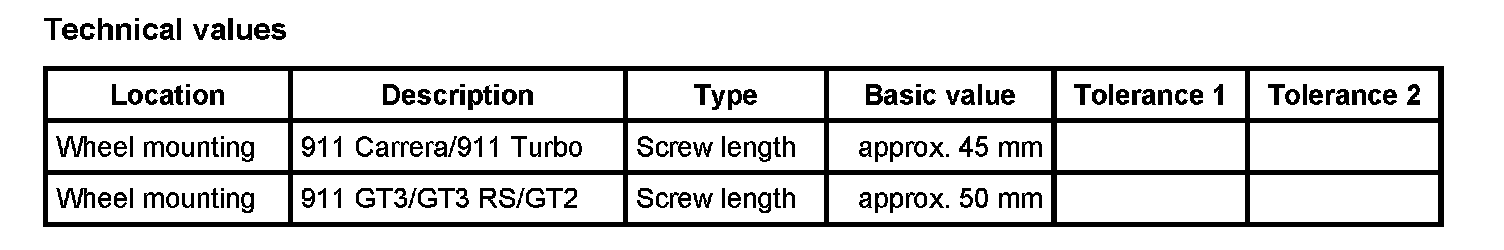 The wheels on the 911 Carrera (997) and 911 Turbo (997) are secured using the same standard wheel bolts -A- (M14 x 1.5) as are used on the 911 Carrera (996). Length: dimension -X- - Screw length: approx. 45 mm.