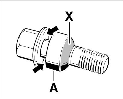 3. Always apply a thin coat of Optimoly TA (aluminum paste) on the thread of the wheel bolts, on the shank and between the bolt head bearing surface and spherical cap ring (under the head) -arrows-. The spherical cap bearing surface -X- of the wheel bolts that face the wheel must not be greased.