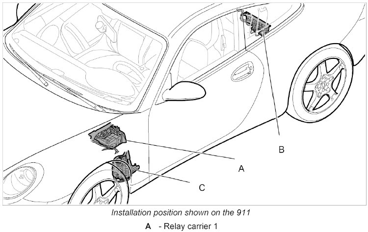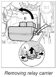 1. -A- Pull apart both retaining lugs on relay carrier support and press the relay carrier upward.