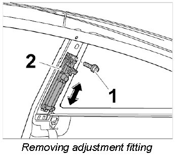 1. Run adjustment fitting -2- down into the B-pillar -direction of arrow- and tighten the fastening screw -1-. Tightening torque: 17 ftlb.