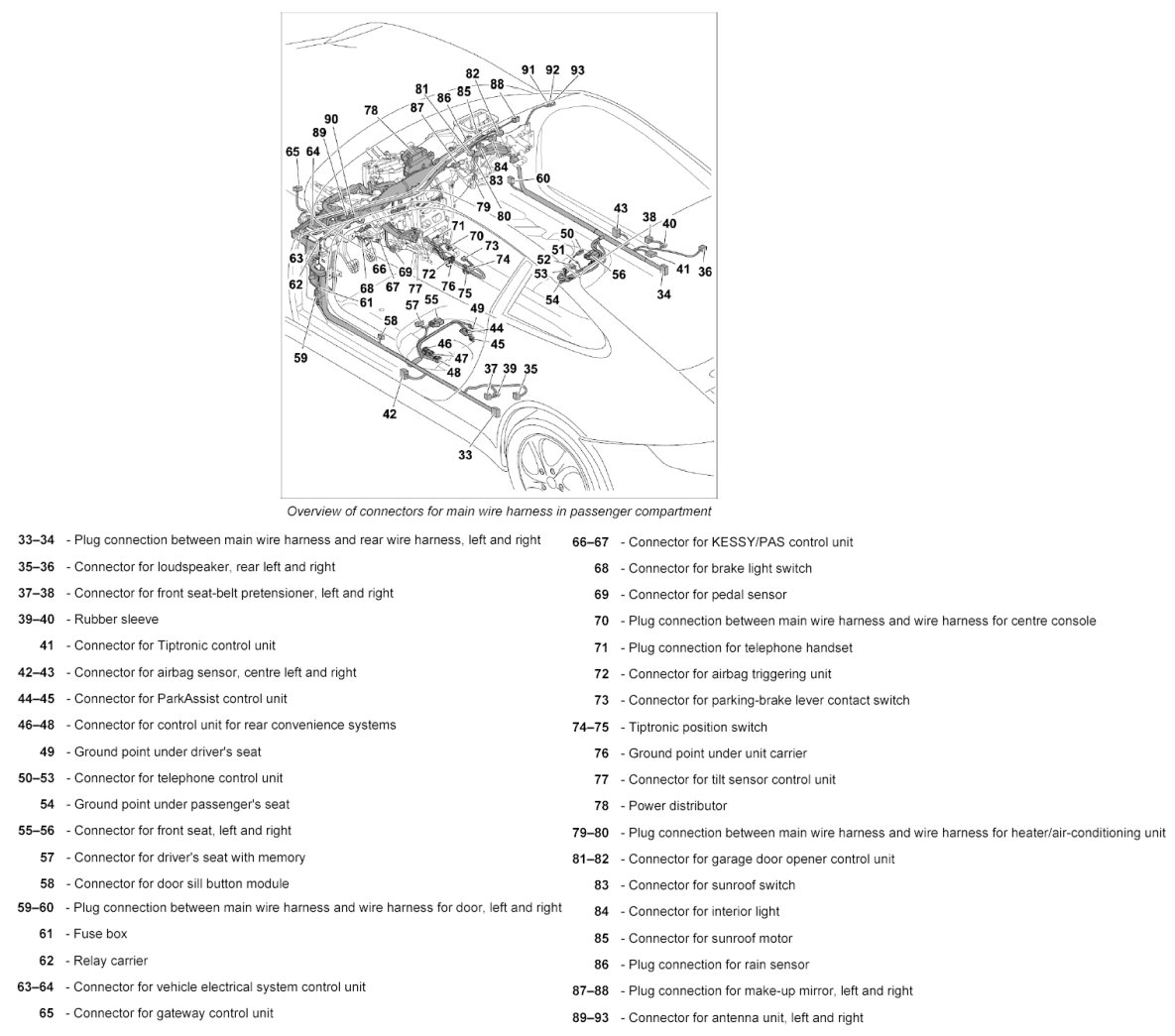 21. Push together plug connection between main wire harness and wire harness for door at the left and right -59 and 60- until they engage securely.