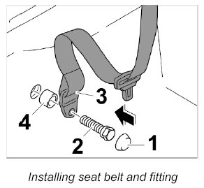 3.1. Tighten fastening screw -2- , seat belt with fitting -3- and spacer sleeve -4- on inner lower side member.