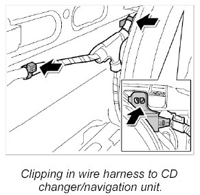 25. Clip in wire harness to CD changer/navigation unit -arrows-.