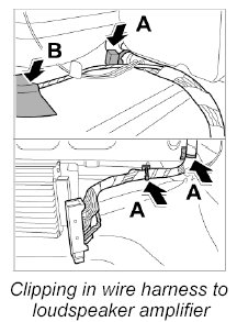 26. Clip in wire harness to loudspeaker amplifier -Arrows A- and fix with new adhesive tape -Arrow B-.