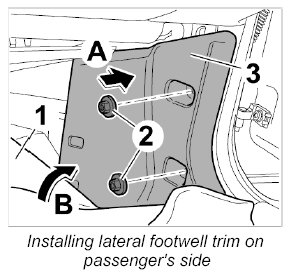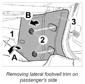 2.2. Unscrew both plastic nuts -2- and take off the footwell trim panel -3- ( -arrow B- ).