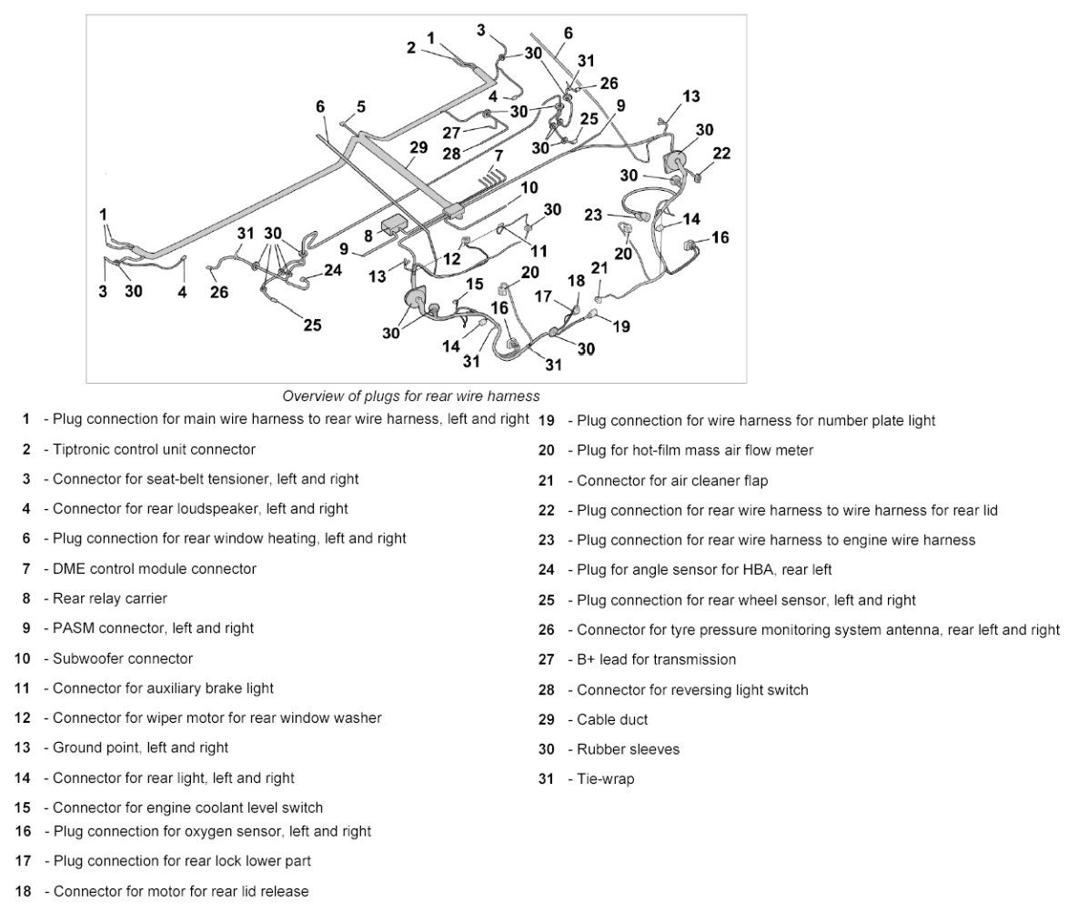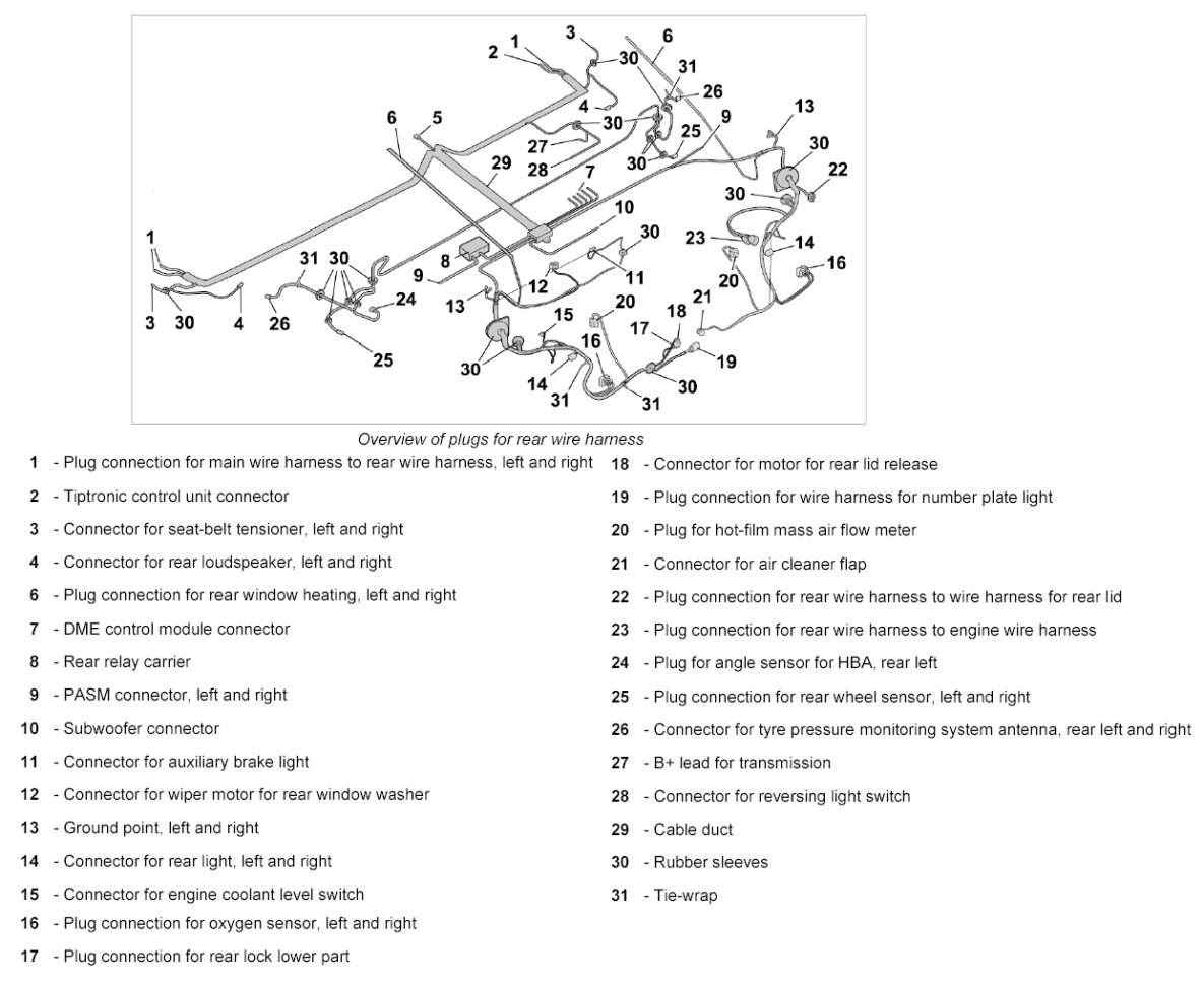 15. Release and disconnect plug connection for rear wire harness to wire harness for rear lid -22-.